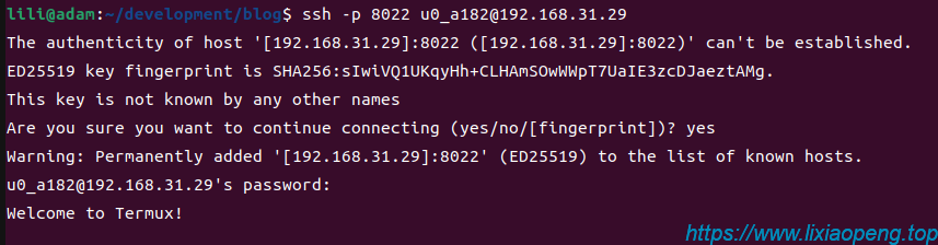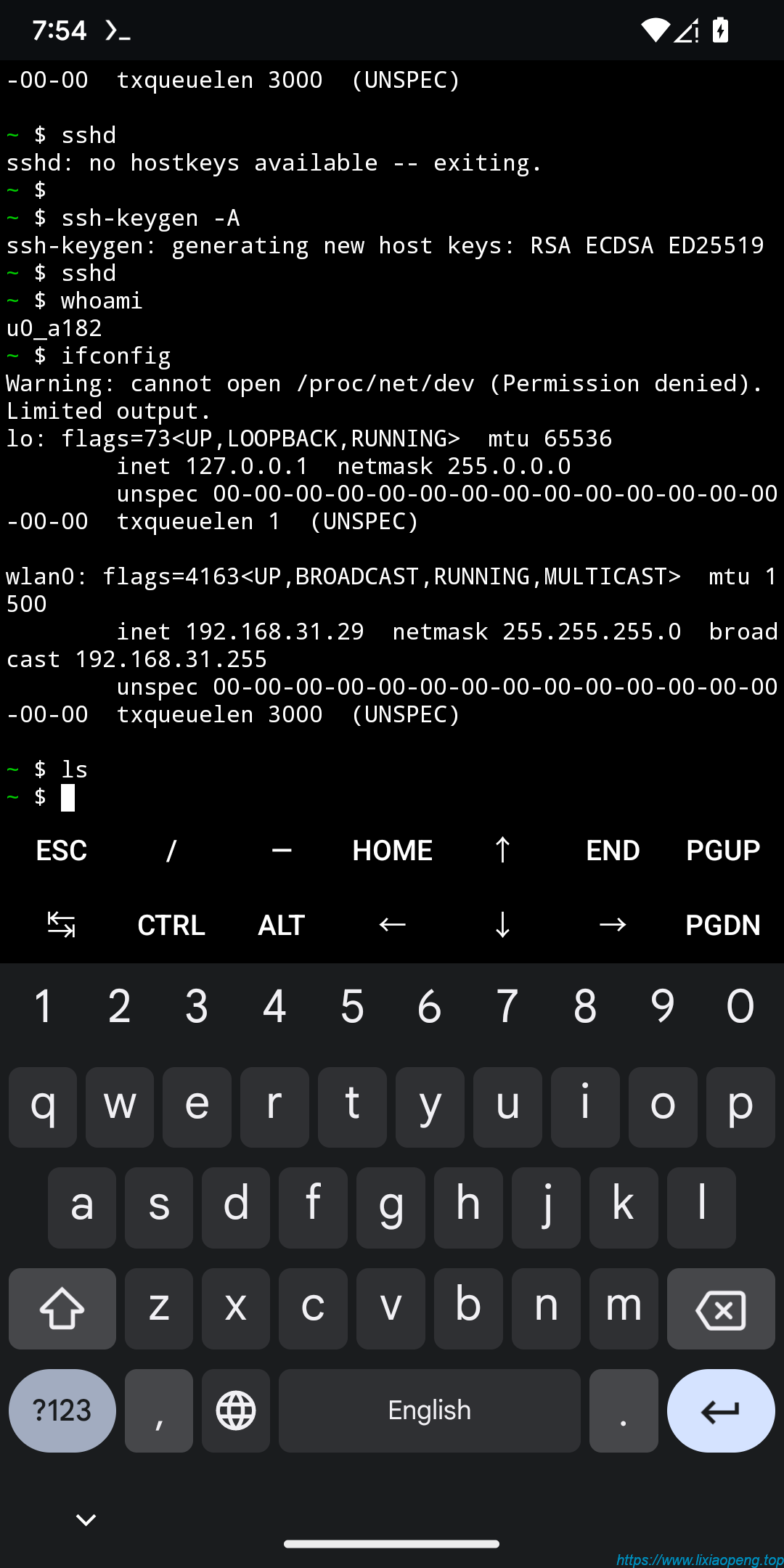 8022是openssh的默认端口,u0_a182是手机上通过whoami得到的用户名,192.168.31.29是我手机的局域网ip。